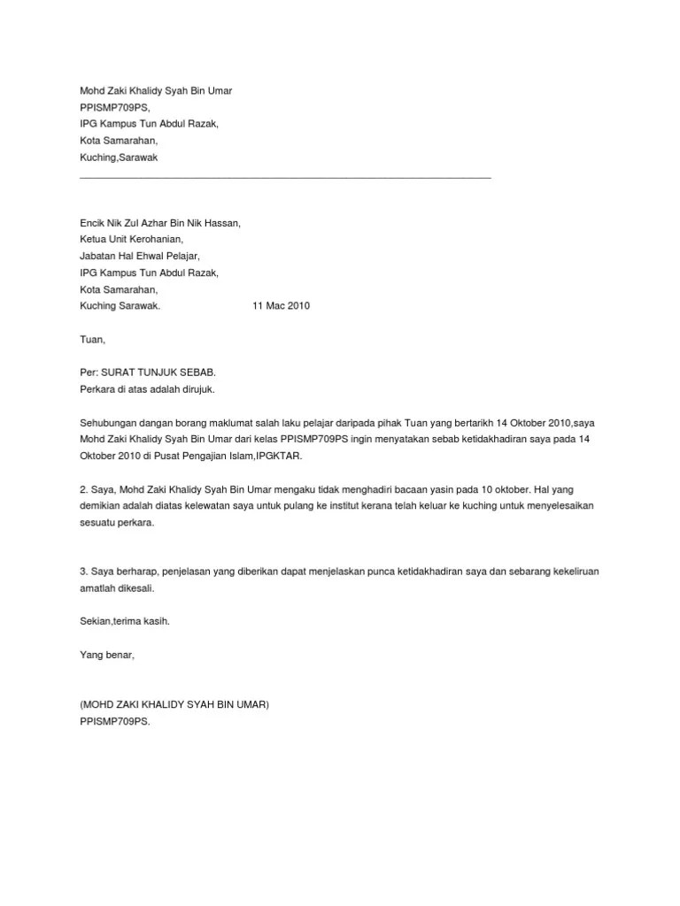 Oleh kerana surat tunjuk sebab merupakan urusan rasmi, maka surat ini . Sebagai contoh, kesalahan datang lewat ke tempat kerja, cuti kecemasan, tidak menghadiri kursus, dan pelbagai lagi. Semua kesalahan dan tindakan yang dilakukan ini memerlukan. Contoh surat tunjuk sebab tak hadir kerja lewat ke tempat otosection from i0.wp pengurus, (nama syarikat) 26080 kuantan, pahang darul makmur. Format surat tunjuk sebab kesalahan tata tertib.